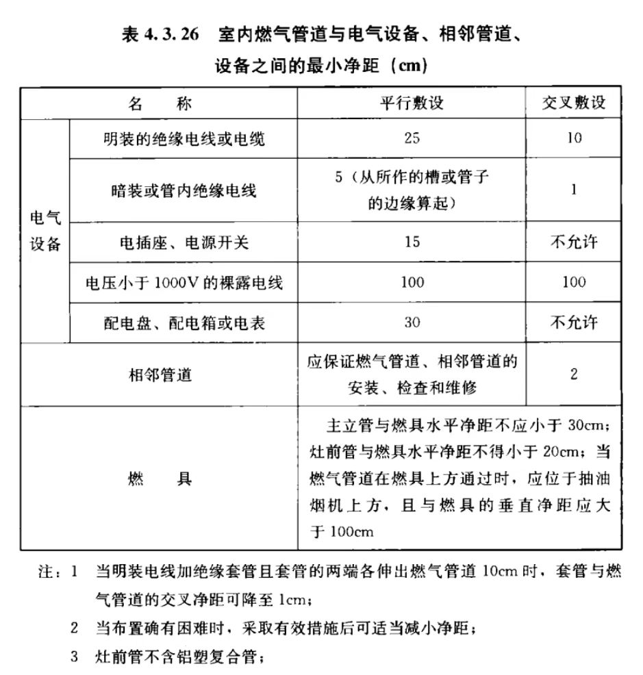 7、室內燃氣管道與電氣設備、相鄰管道、設備之間的距離小于下表規定的