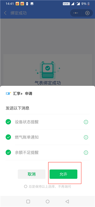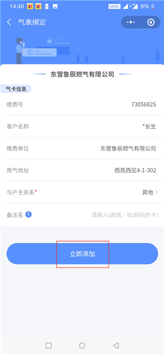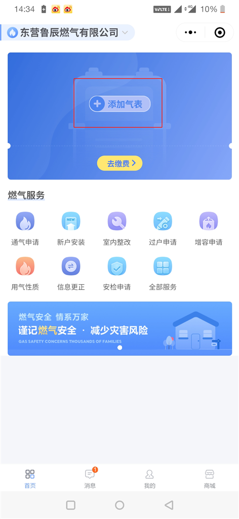 首次繳費需要綁定氣表:點擊“添加氣表”,點擊微信用戶一鍵綁定 ,若之前別人用手機號綁過 請點擊其他手機號綁定,出現提示均點擊允許,選擇“繳費號”,輸入繳費號后點擊“立即查詢”,(繳費號若不清楚可聯系當地服務部查詢)出現信息后核對用氣地址是否正確,若無誤點擊立即添加。提示成功后點擊允許。返回至首頁,點擊去繳費,