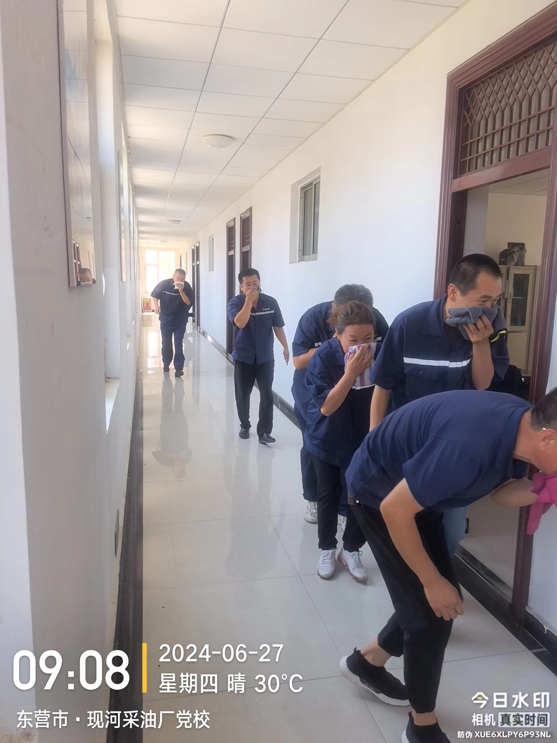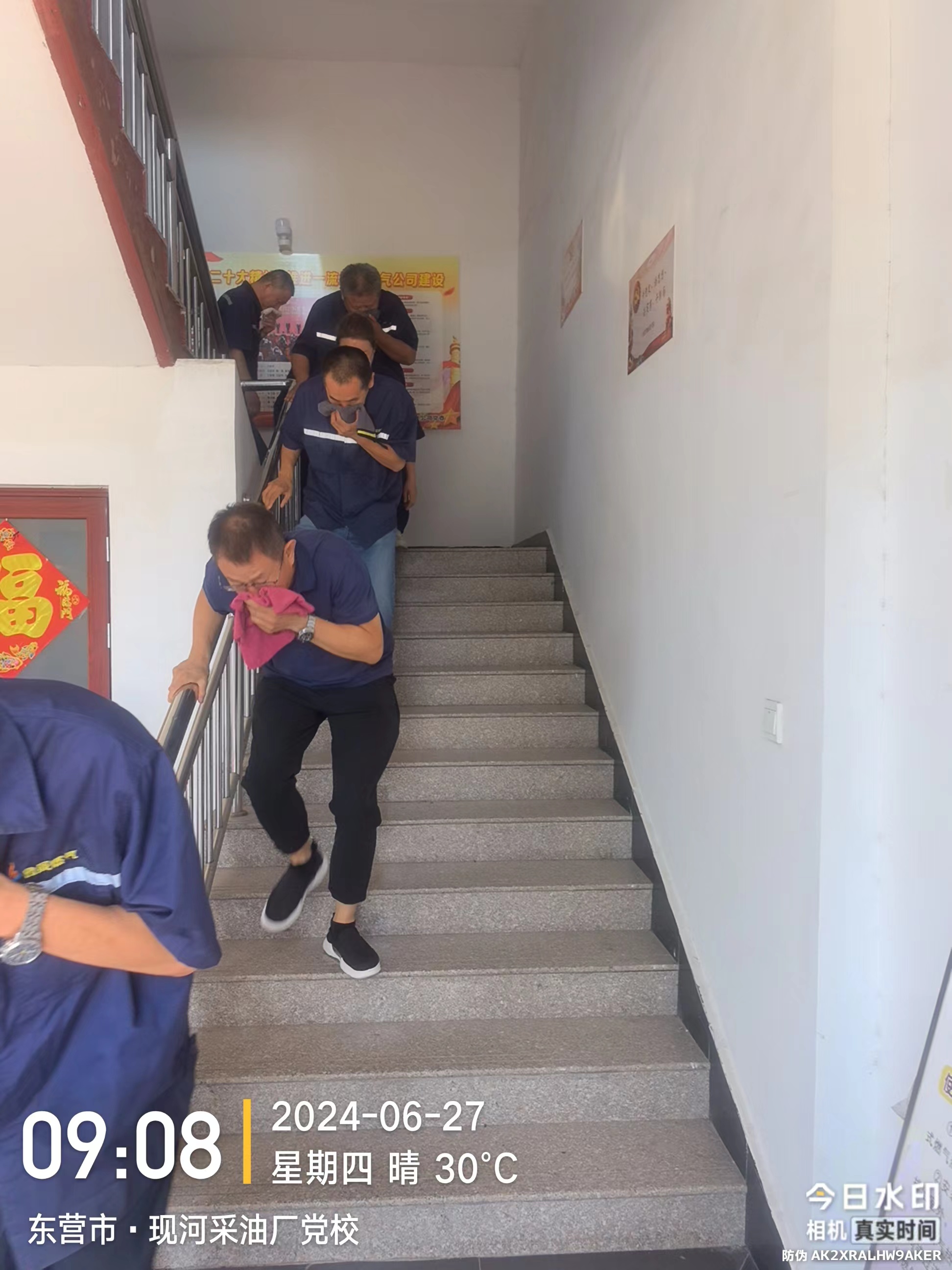 聽聞喊話,大家迅速用毛巾、手絹等物品捂住口鼻從樓梯口弓腰快速有序撤離辦公樓。期間疏散、警戒人員履職盡責,指揮導向人員快速疏散撤離,直至確認最后一個人撤離辦公樓。